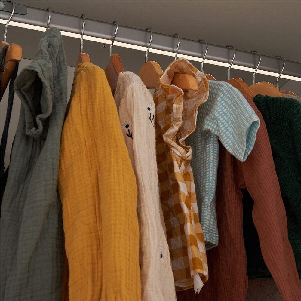 Meet our Fuori Wardrobe – a Scandinavian-inspired blend of modern simplicity and functionality. With exposed legs and handleless slow-close doors, it’s the ideal option for those desiring a clean, contemporary nursery atmosphere. Seamlessly merging style and functionality, this wardrobe provides ample storage, featuring a hanging rail with LED sensor lights and an extra concealed drawer for discreet organisation.