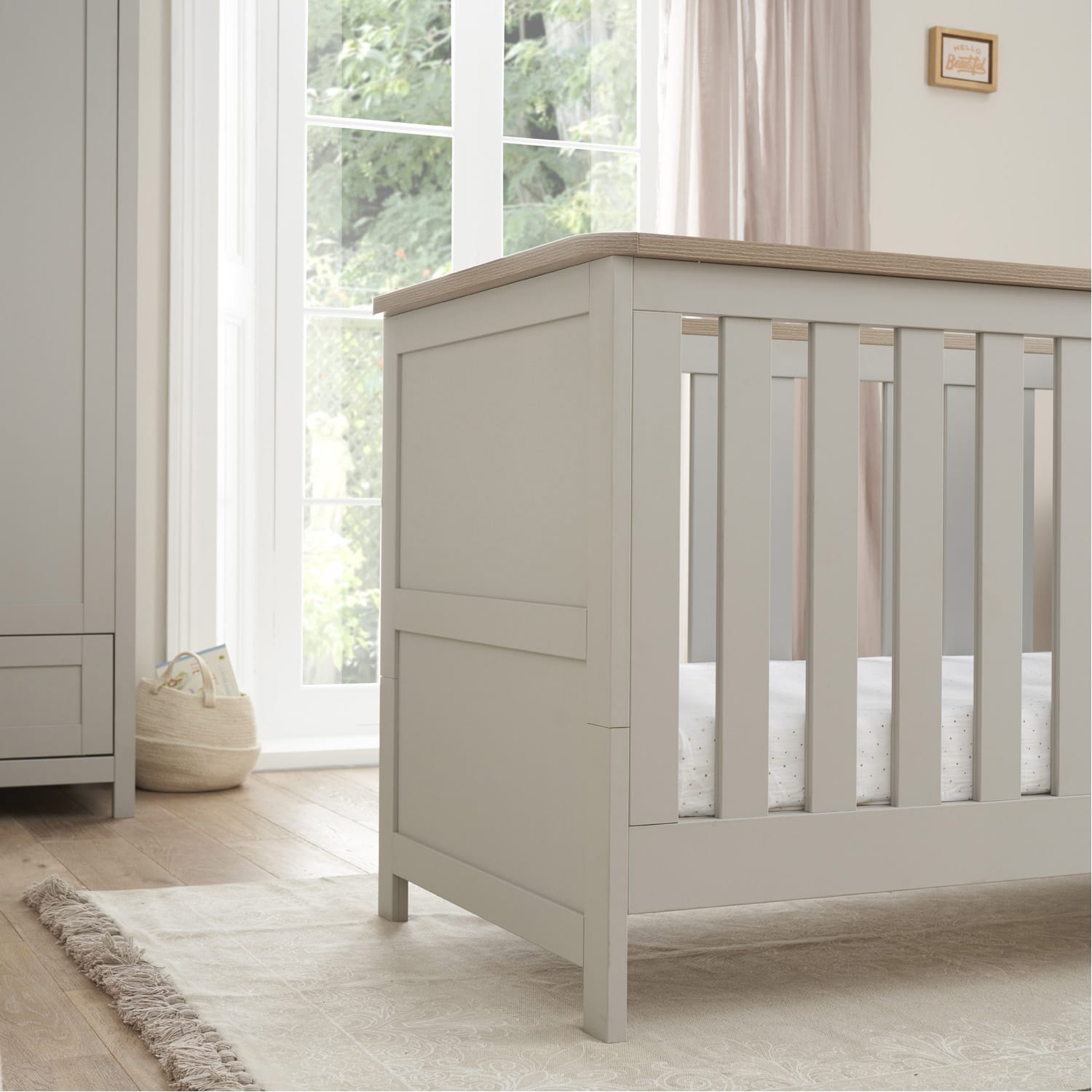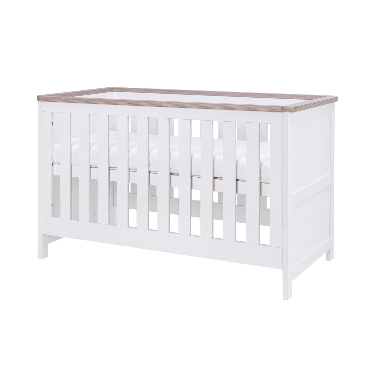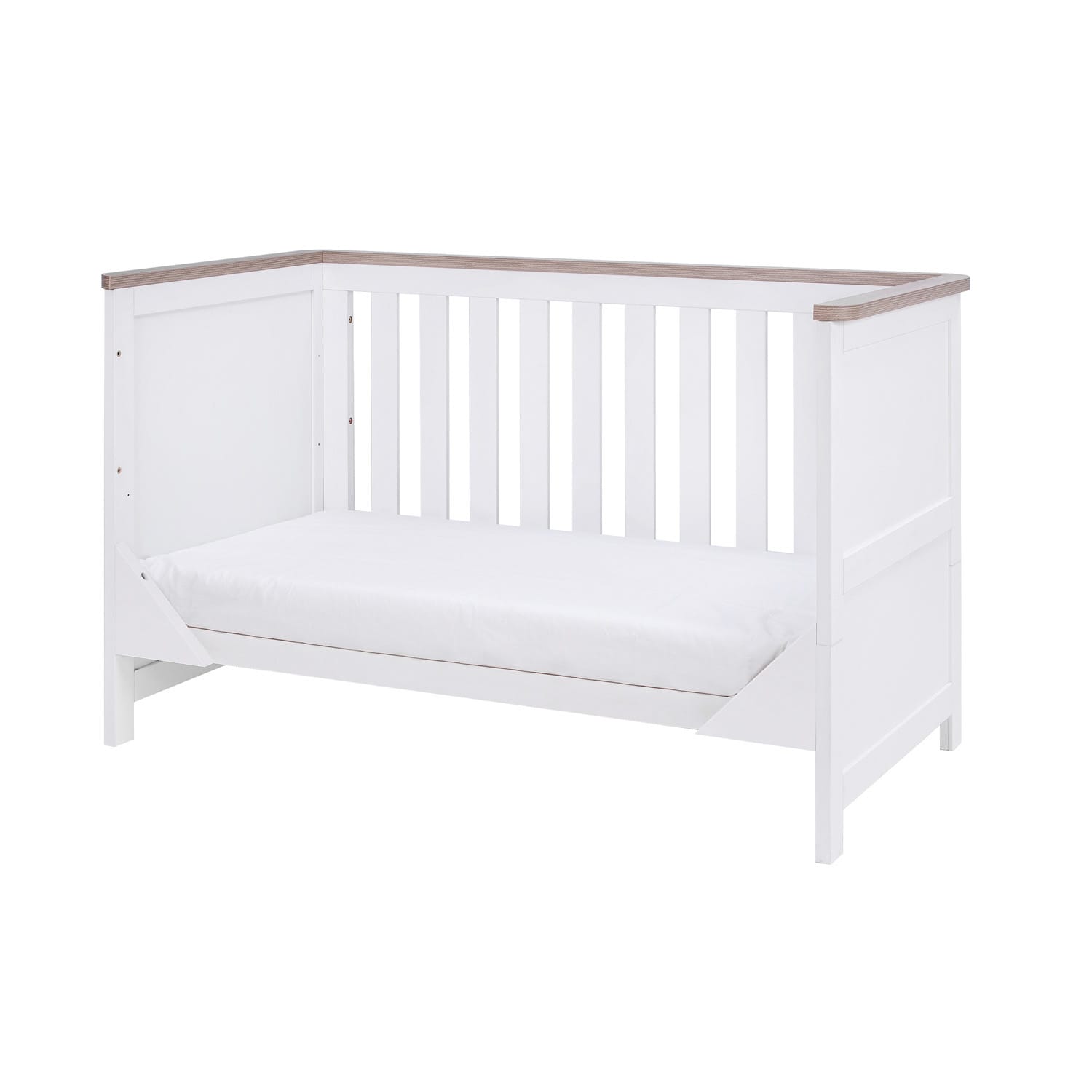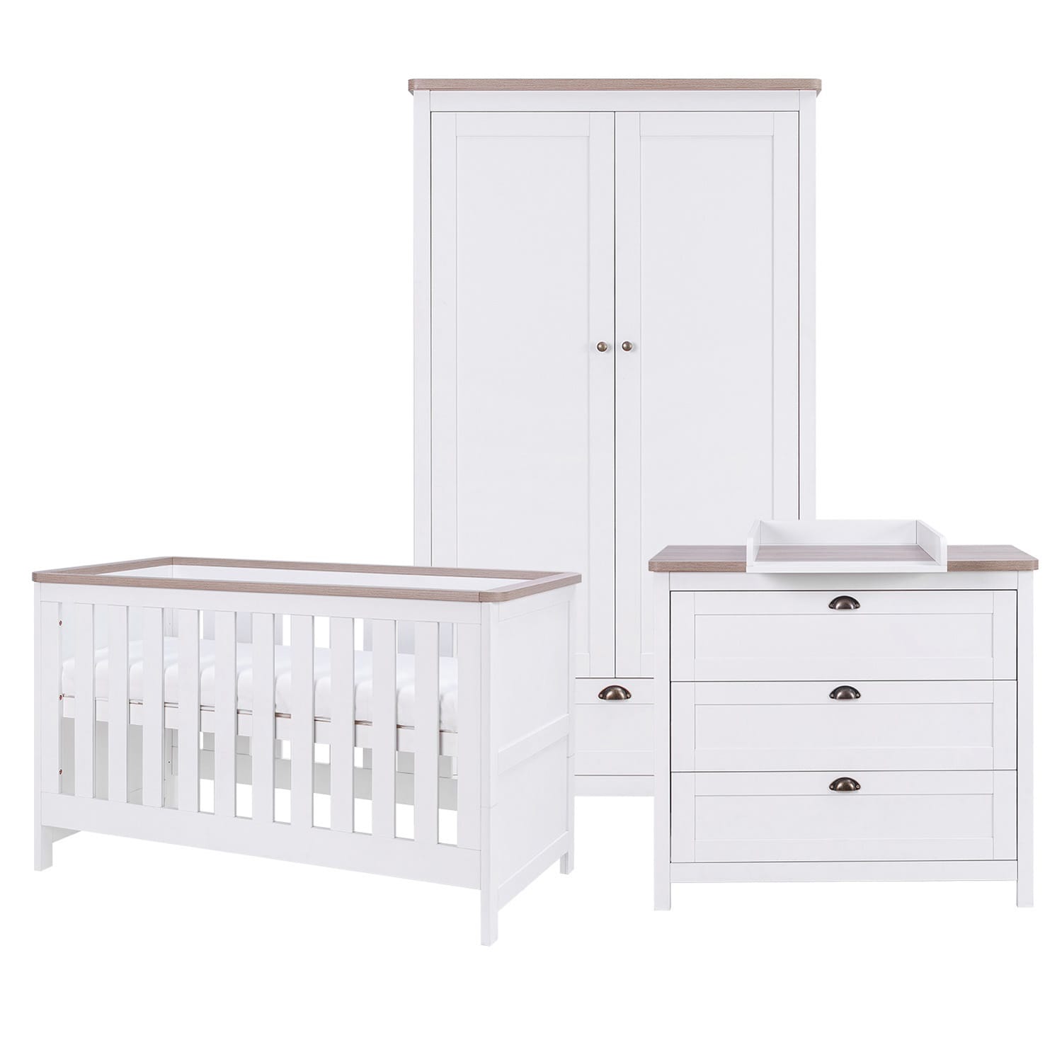 Designed with clean lines and finished in white and oak, the Verona 3 piece nursery furniture set promises a beautiful traditional look for your nursery. This shaker style furniture set consists of a full sized cot bed, chest changer and wardrobe giving you ample storage for your growing family.